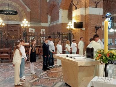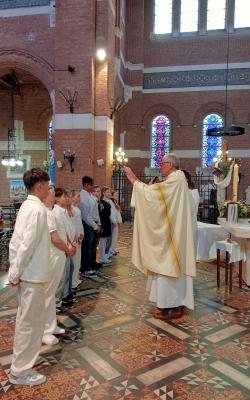 Lilas, Théo, Jade, Hugo, Maïly, Tom, Elsa, Charlie, Emma et Nathan sont entrés dans l'Église, accueillis par le Père Bertrand et Patrick notre diacre et Mathéo au nom de la Paroisse Notre Dame du Fief en Flandres.